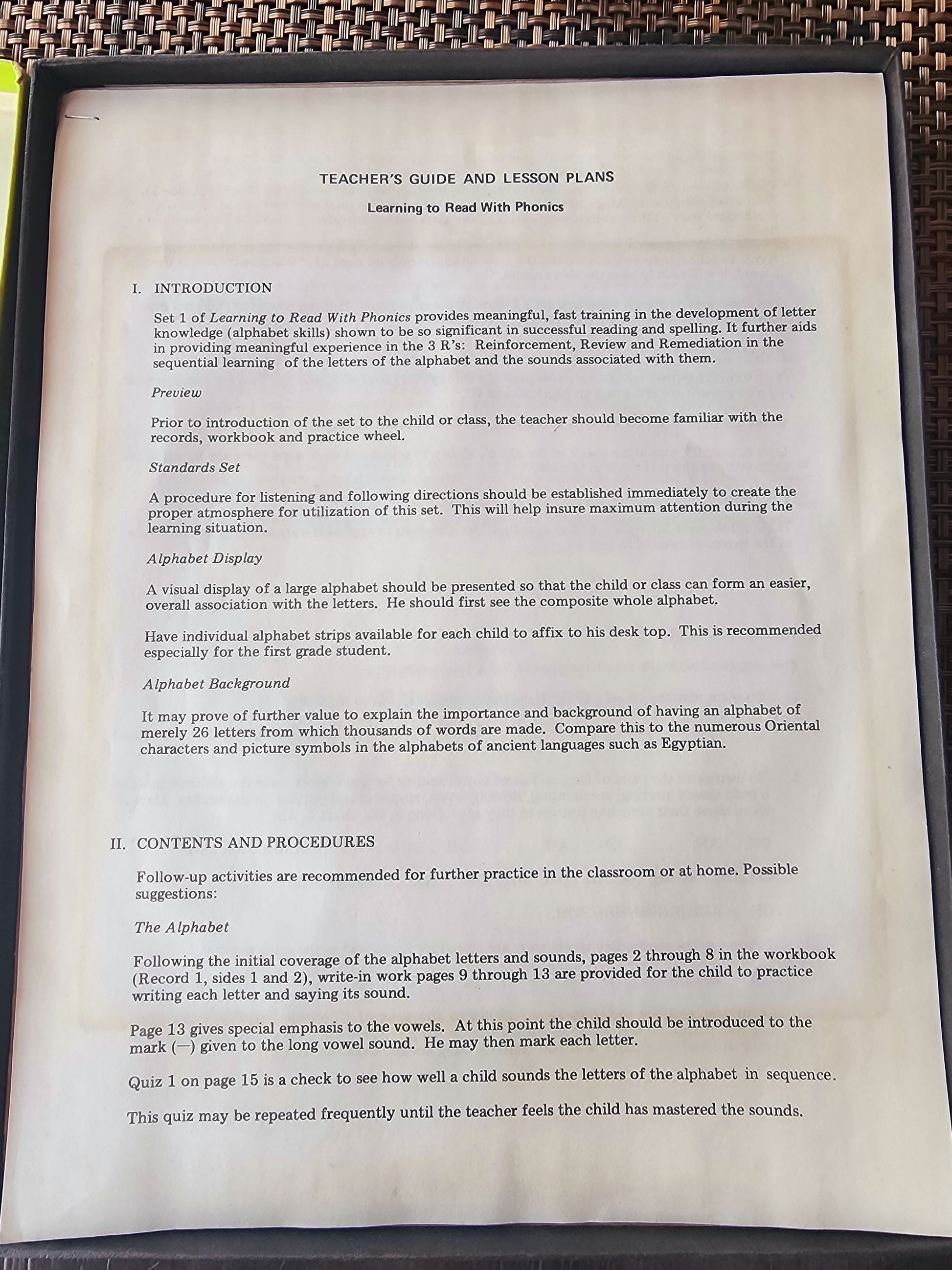 This vintage "Learning To Read With Phonics", Series 700 Set A 1970 Kit by Teaching Aids Institute is an activity book designed for teaching reading using phonics. Published in 1970, this kit includes teaching aids in a kit format. It is focused on helping individuals learn how to read through phonics-based methods, making it a valuable resource for educators and parents looking to support early literacy development.
