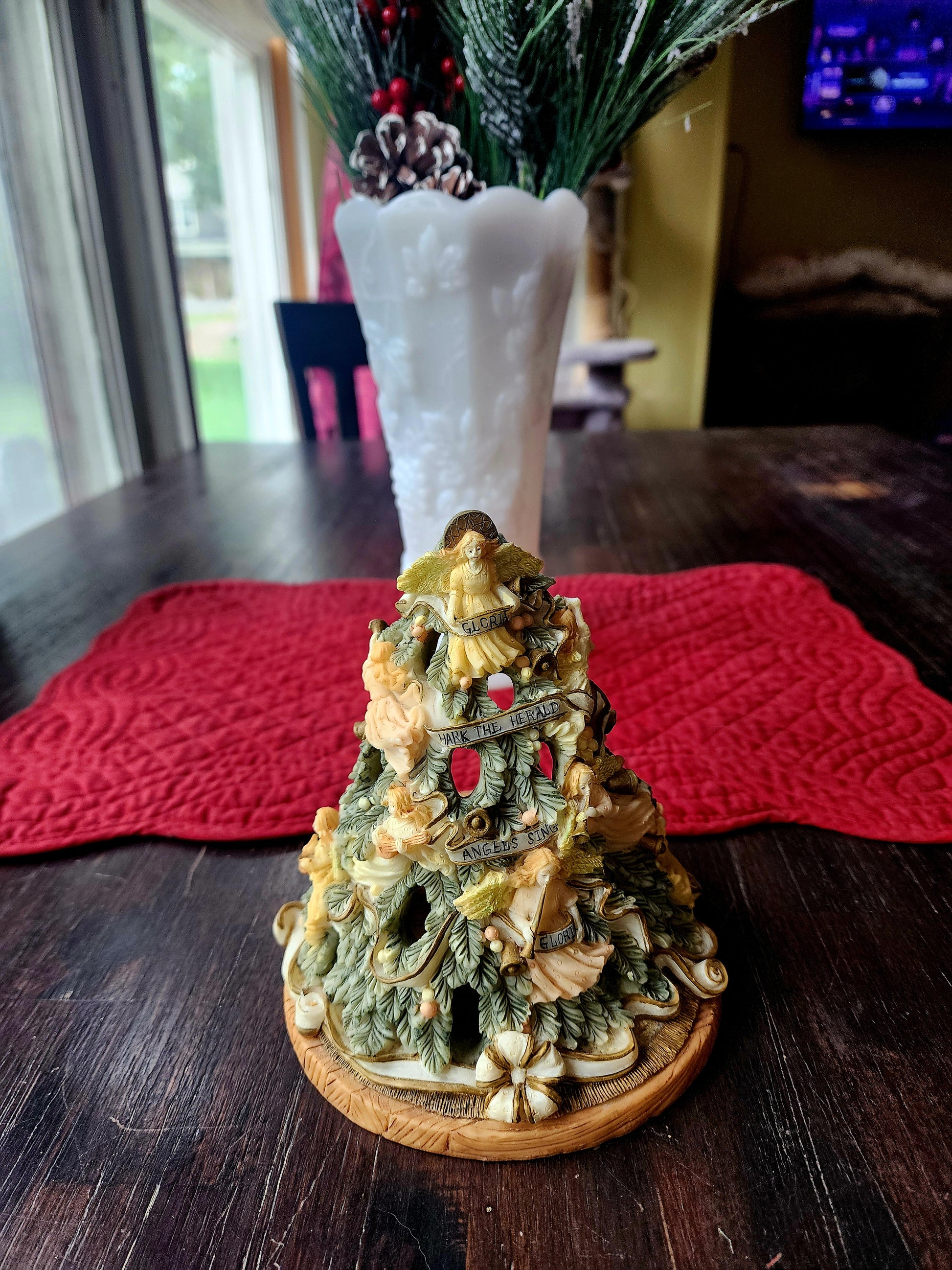 The Vintage Christmas Tree and Angels Votive Candle Holder is a charming and festive decor piece perfect for the holiday season. Made of resin and featuring a multicolor design, this angel-branded tea light holder is adorned with a Christmas tree motif. The inclusion of angels adds a touch of religious significance, making it a thoughtful and unique gift for those who appreciate vintage and nostalgic decor. The tea scent adds a cozy and inviting ambiance to any room, making it a perfect addition to a Christmas-themed tabletop display.