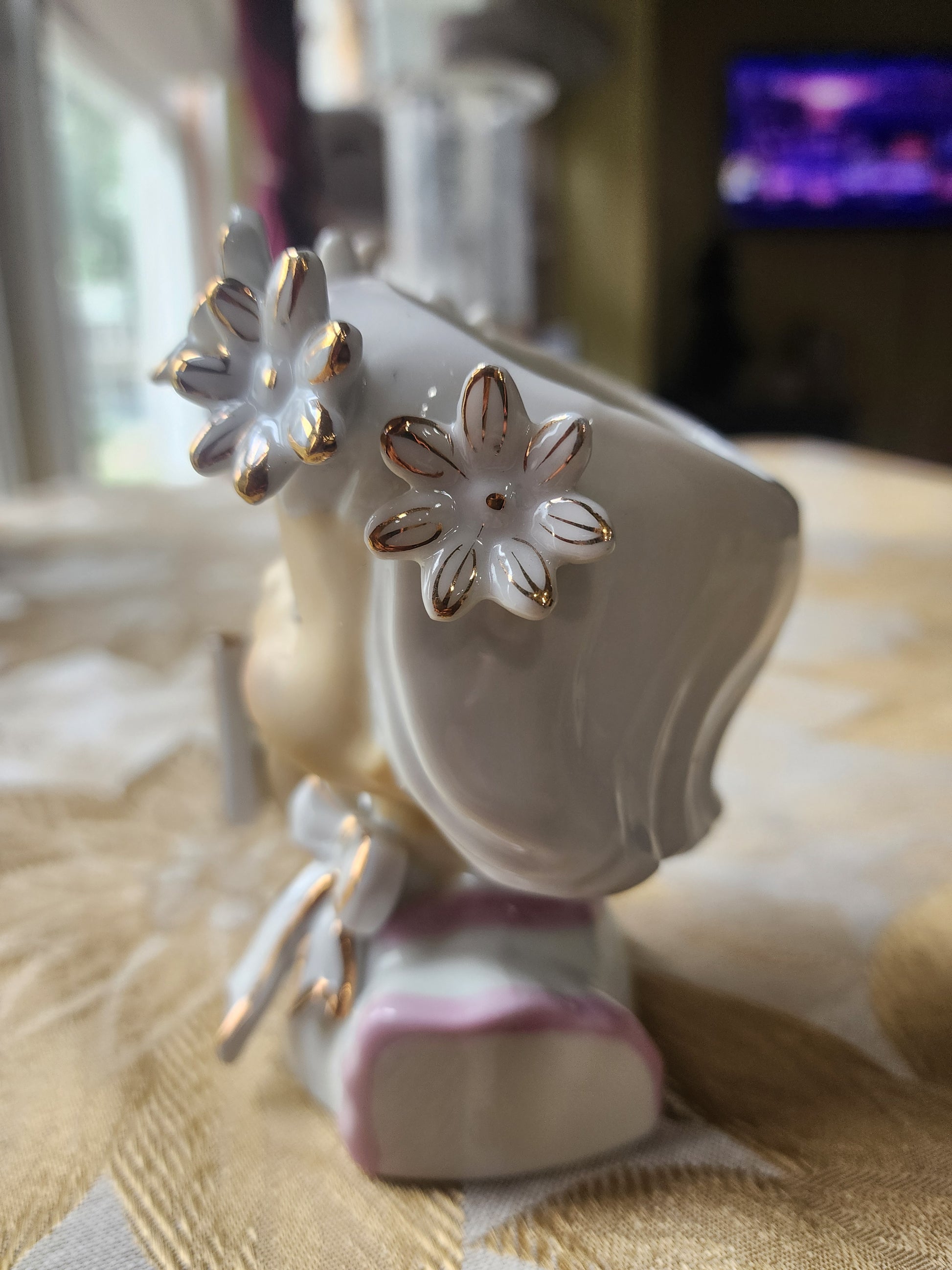 Vintage Napco Head Vase Girl with Floral Crown, Bow, Pink and White Dress 1950s